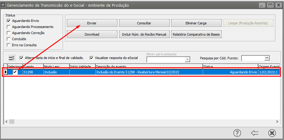 Selecione o evento S1298 gerado e faça o envio para o Portal do eSocial