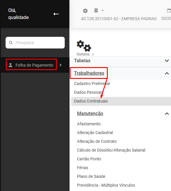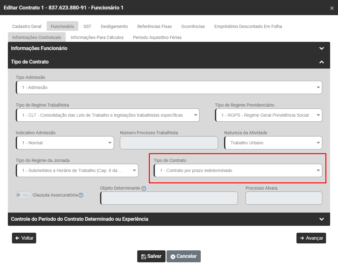 Acesse a aba Funcionário>Informações Contratuais Campo Tipo de Contrato e verifique se o Campo Tipo de Contrato está com Contrato por prazo indeterminado