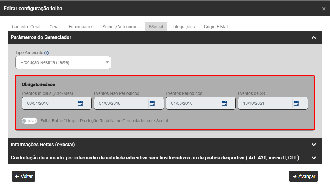 Edite as Configurações da Empresa que apresentou a inconsistência na aba ESocial e faça a conferência das Datas de Obrigatoriedade