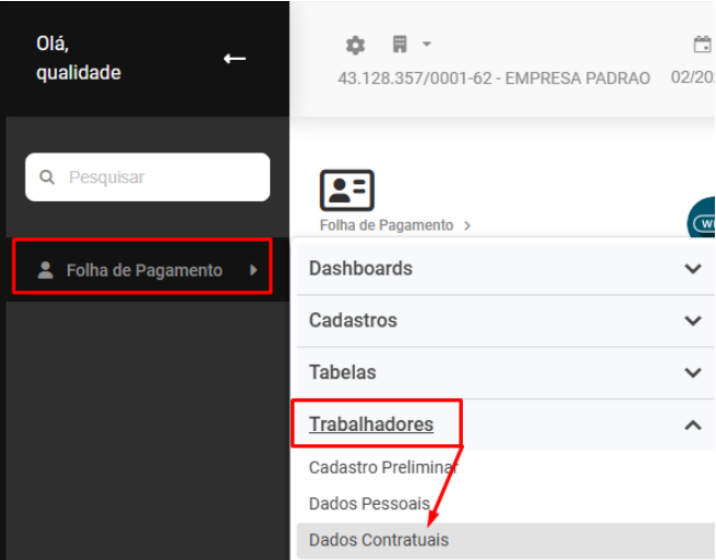 Correção: Acesse o menu Folha de Pagamento>Trabalhadores>Dados Contratuais
