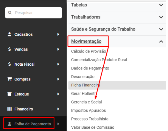 Em seguida acesse o menu Folha de Pagamento>Movimentação>Gerencia eSocial