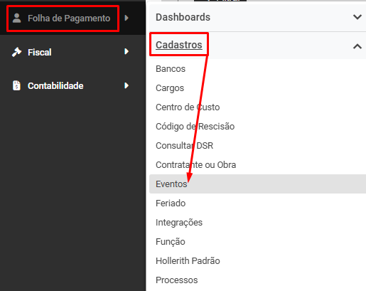 Como corrigir: Acesse o menu Folha de Pagamento>Cadastros>Eventos