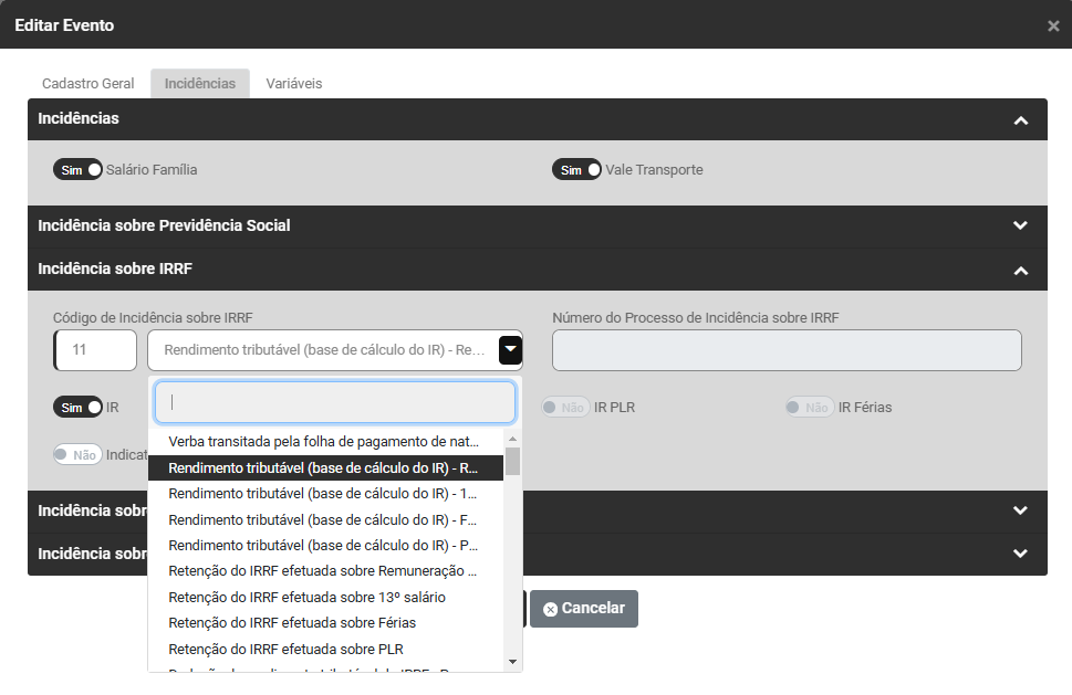 1. No cadastro do evento, na aba Incidências, no campo Incidência sobre IRRF, informe uma incidência válida.