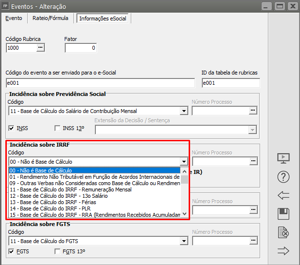 Ação Sugerida: O valor informado no campo deverá existir na Tabela 21 - Códigos de Incidência Tributária da Rubrica para o IRRF. Verifique nessa tabela se o código de IRRF está válido e se é o ideal ao seu evento.