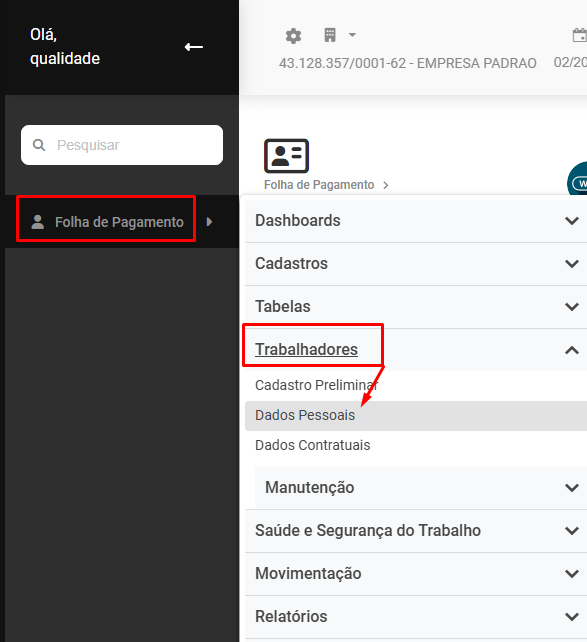 Correção: Acessar o menu Folha de Pagamento>Trabalhadores>Dados Pessoais