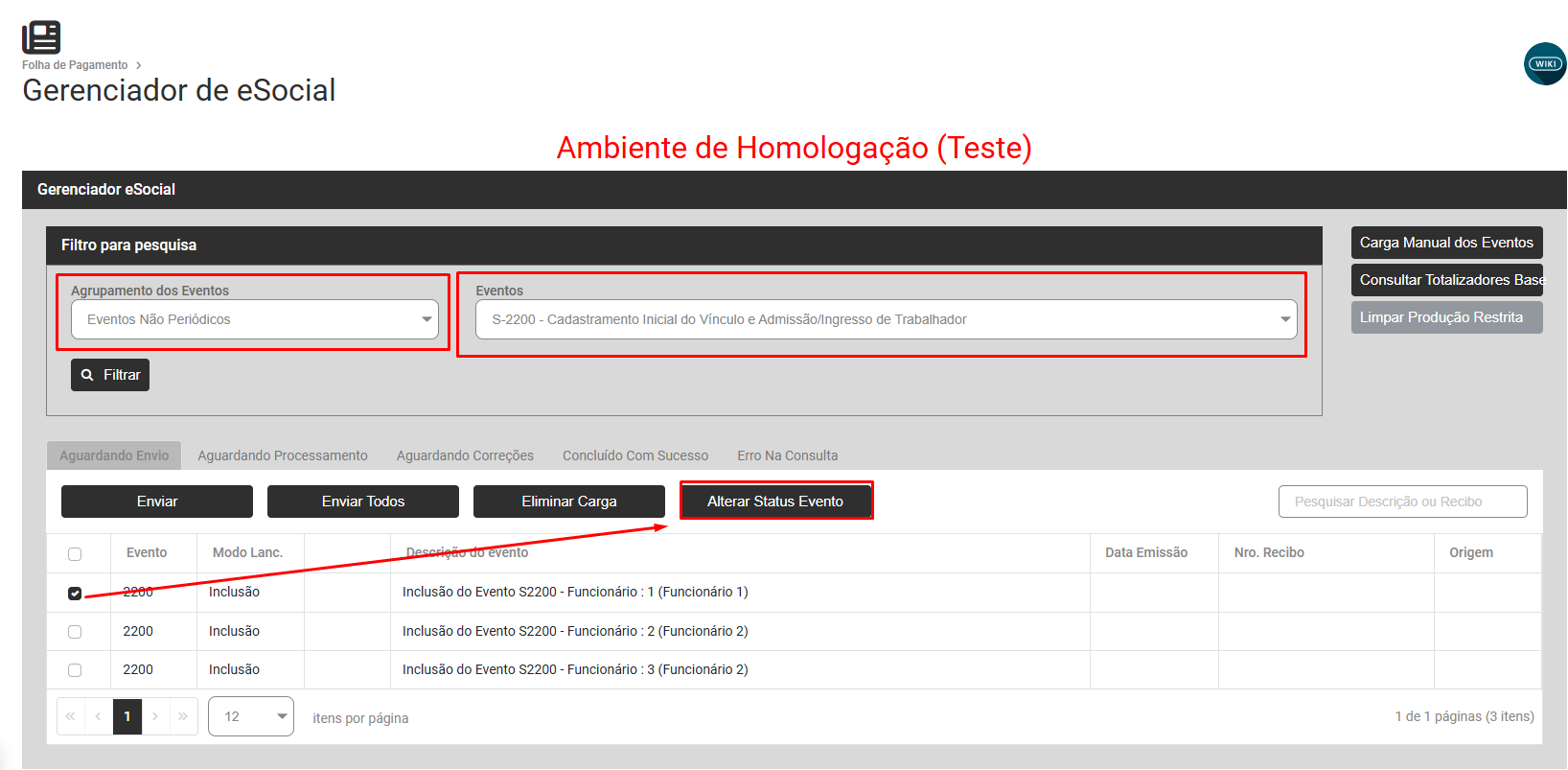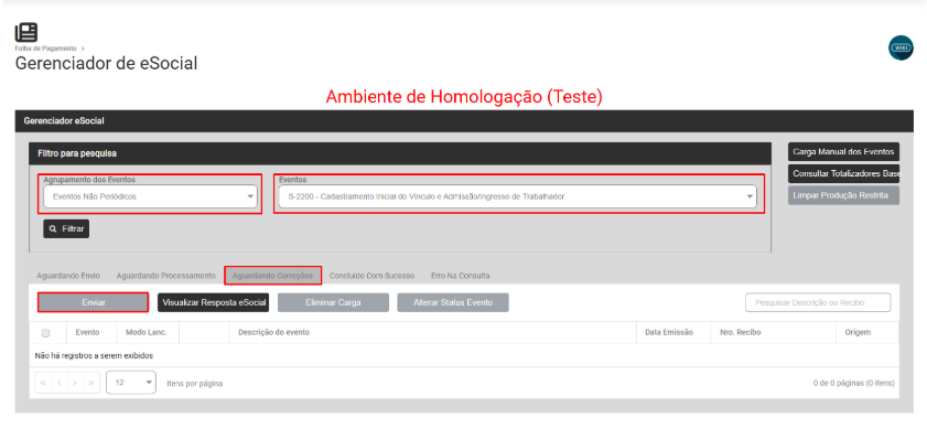 Filtre por Eventos Não Periódico - S2240 - Aguardando Correção selecione o Evento e faça novamente o envio para o Portal do eSocial