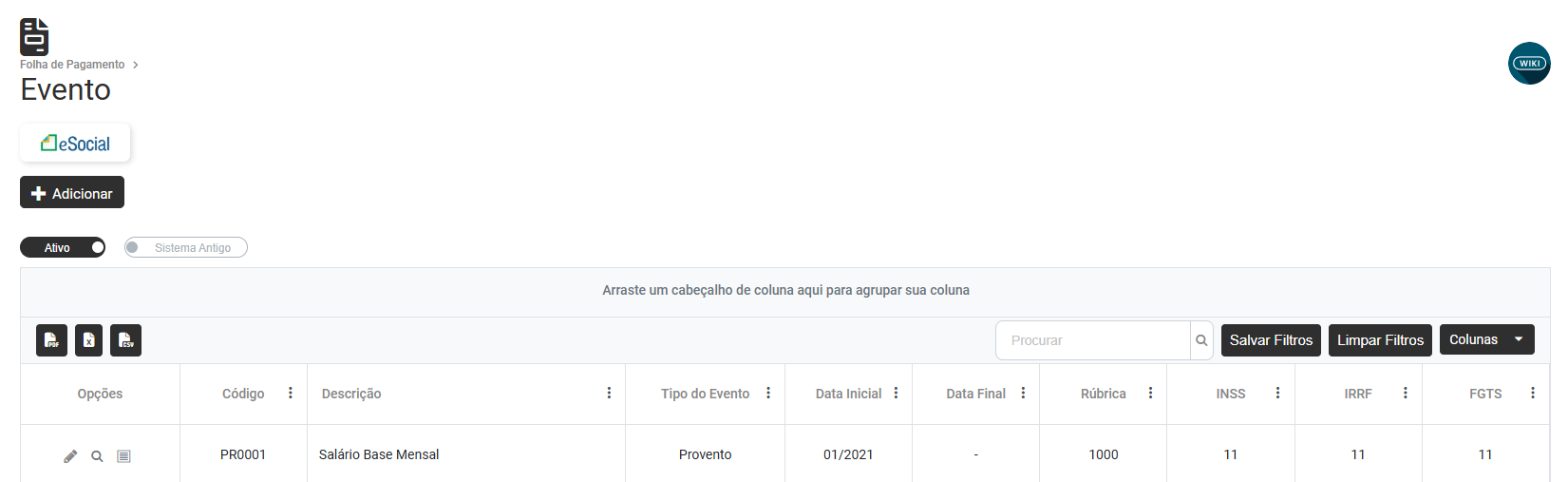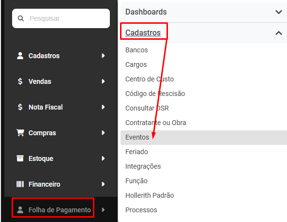 Solução: Acesse o menu Folha de Pagamento>Cadastros>Eventos