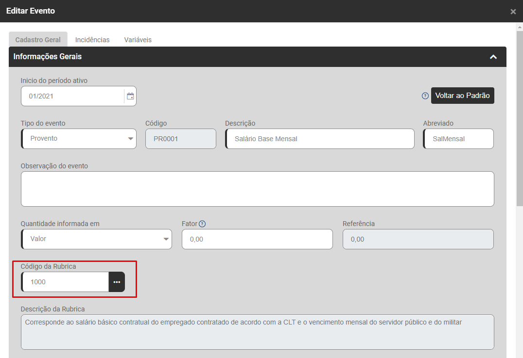 Acesse a aba Cadastro Geral, analise a rubrica na legislação para esse evento, acerte o cadastro e salve