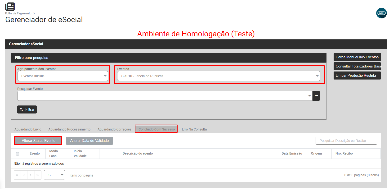 Defina Eventos Iniciais - S1010 - Concluído com Sucesso - e mude o Status para Aguardando Envio