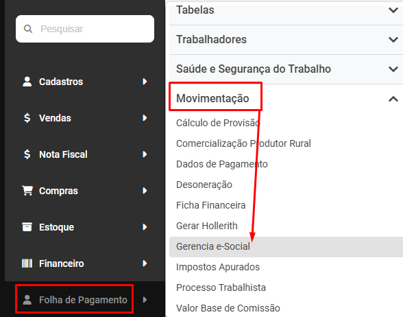 Correção: Acesse o menu Folha de Pagamento>Movimentação>Gerencia eSocial