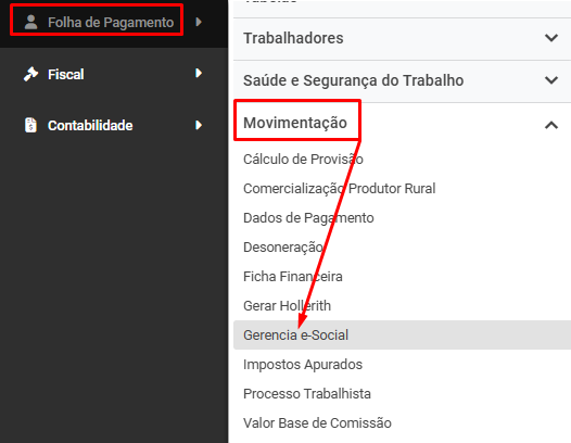 Correção: Acesse Folha de Pagamento>Movimentos>Gerencia eSocial