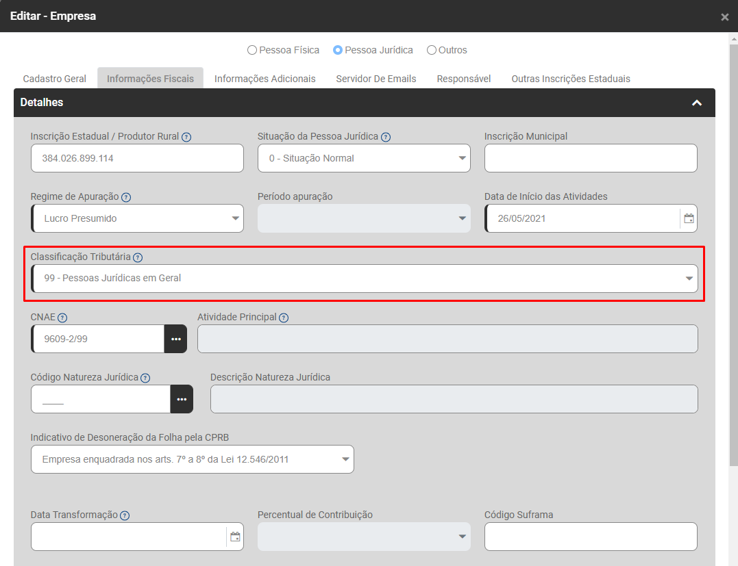 Edite a empresa que apresentou a inconsistência e acesse a aba Informações Fiscais>Detalhes - Campo Classificação Tributária