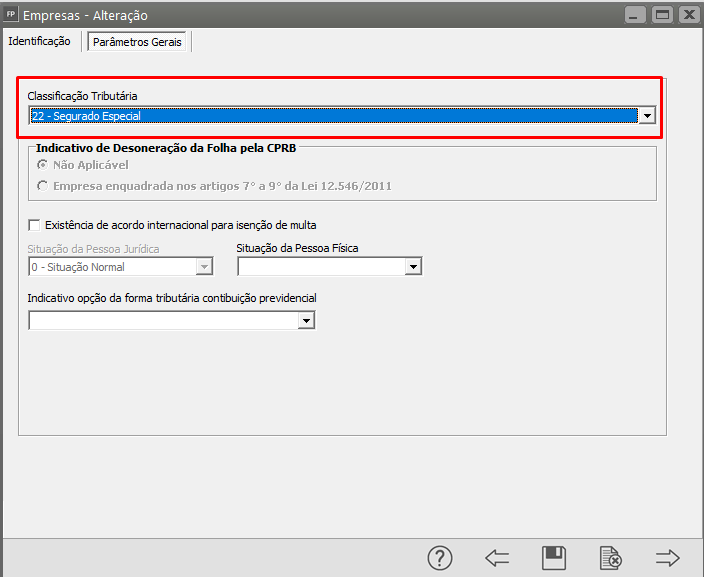 Acesse a aba Parâmetros Gerais e verifique qual a Classificação Tributária informada para a Empresa