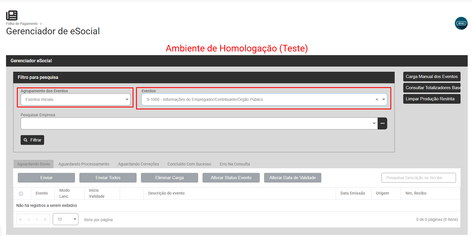 b) Se a Classificação Tributária estiver cadastrada com erro, faça a correção, envie a correção para o Portal do eSocial através do menu Folha de Pagamento>Movimentação>Gerencia eSocial