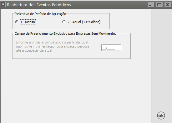 Será apresentada a tela para que você defina o Indicativo de Período de Apuração (Mensal ou Anual), faça a definiçconfirmação e clique em OK