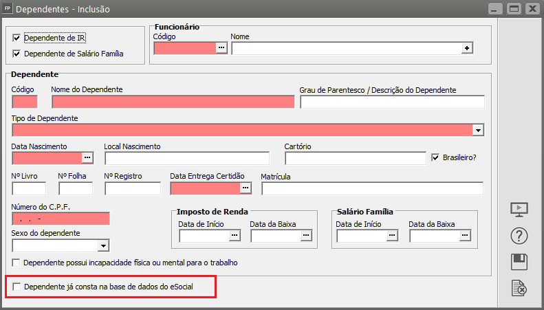 2.Abra o cadastro do dependente, desmarque a opção: 'Dependente já consta na base de dados do eSocial'.