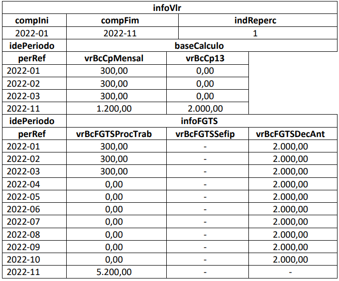 Nessa ação, foi celebrado acordo no qual foi determinado o pagamento das horas extras pleiteadas e o pagamento das verbas rescisórias. Foi determinado, também, o recolhimento do FGTS mediante guia própria, relativo ao período trabalhado, inclusive sobre as horas extras e sobre as verbas rescisórias decorrentes do acordo e, ainda a indenização compensatória de 40% incidente sobre o saldo da conta vinculada, após os correspondentes recolhimentos. Além disso, no acordo ficou estabelecido que o empregador deve recolher as contribuições previdenciárias incidentes sobre as horas extras e sobre as verbas rescisórias. Para fins de Contribuição Previdenciária, no campo [vrBcCp13] deve ser informado o valor de R$ 2.000,00, na competência do desligamento, resultante do somatório do valor de R$166,67 referente a “13º salário sobre aviso prévio indenizado” com o valor de R$ 1.833,33, referente ao 13º salário proporcional. Para fins de FGTS, as verbas rescisórias que são base de cálculo devem ser somadas e informadas no mês do desligamento. As “Demais verbas indenizatórias” não são base de cálculo para CP e FGTS. Nesse caso, devem ser prestadas informações conforme descritas no quadro abaixo: