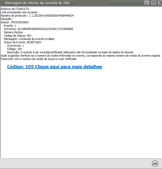 Código 0105 - “O evento a ser excluído/retificado (alterado) não foi localizado na base de dados do eSocial