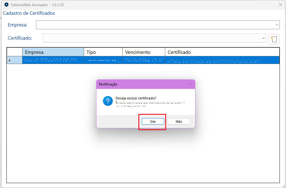 Caso o certificado adicionado esteja com sua validade vencida será necessário excluir ele do Assinado Web, para isso dê 2 cliques nele com o botão Esquerdo do mouse e clique SIM na mensagem de confirmação de exclusão do certificado:
