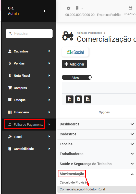 Para cadastrar a Comercialização do Produtor Rural você deverá acessar o menu Folha de Pagamento>Movimentação>Comercialização Produtor Rural