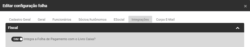 F.1) Fiscal - Se você possuir o Módulo Fiscal poderá definir se Integra a Folha de Pagamento com o Livro Caixa