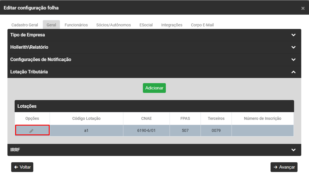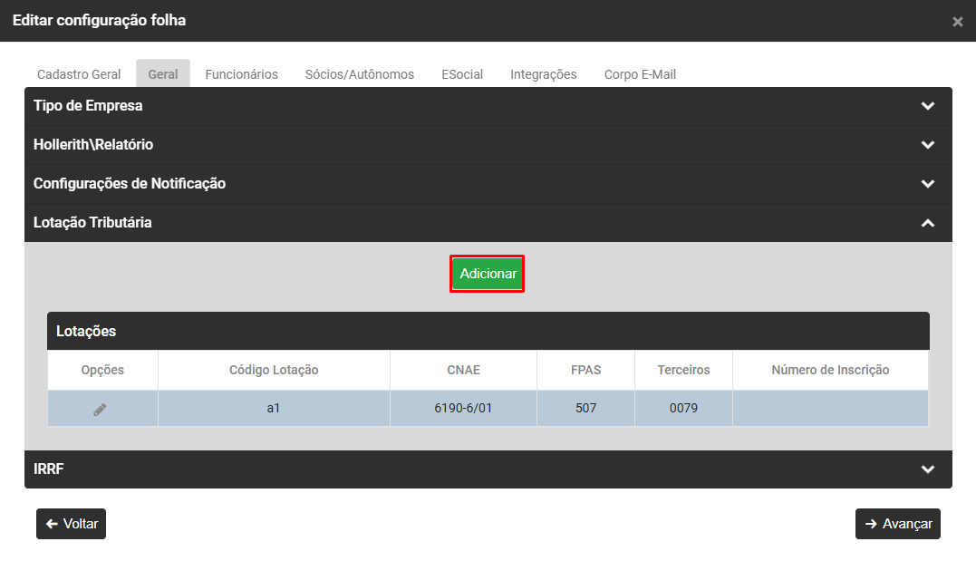 Clique no Botão Adicionar para informar a Lotação Tributária da Empresa