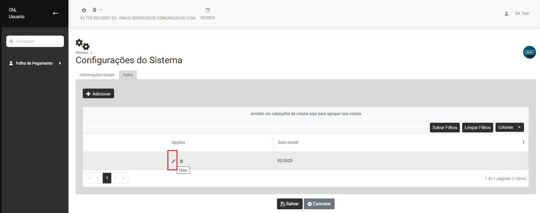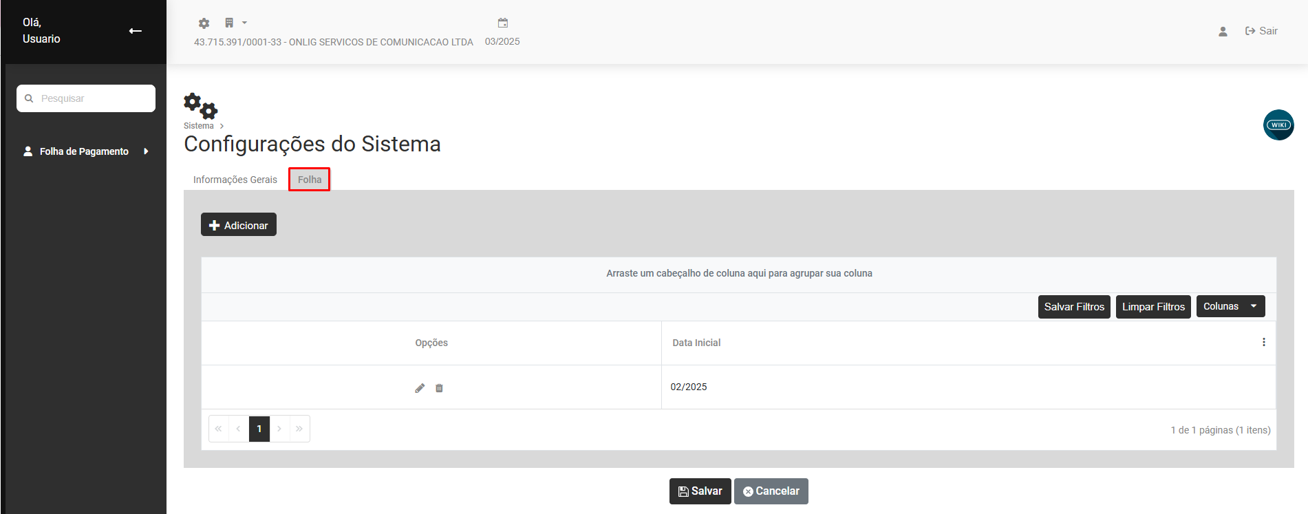 Será apresentada a tela para que você realize a Configuração do Módulo Folha de Pagamento, clique em Adicionar para cadastrar uma nova Configuração ou clique no botão 'editar" com o desenho do lápis para alterar ou visualizar uma Configuração realizada anteriormente.