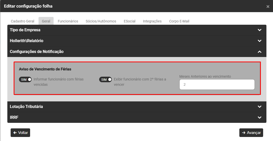 - Exibir funcionário com 2º férias a vencer - A partir do momento que o usuário defina o número de meses anteriores ao vencimento da 2ª férias do trabalhador, o Módulo alertará o usuário que restam aquela quantidade de meses para que determinado trabalhador tenha a segunda férias vencidas.