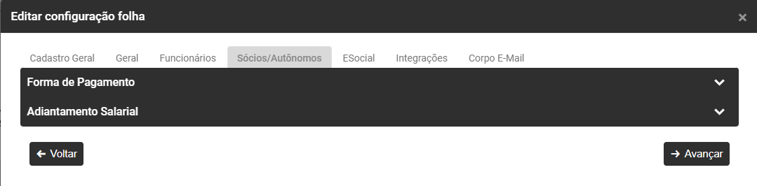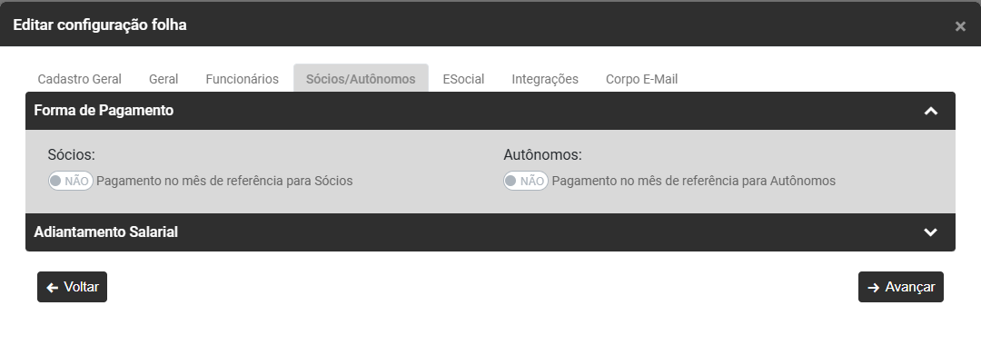 - Autônomos - defina se o Pagamento será no mês de referência, caso não seja definido o Módulo irá considerar pagamento no Quinto Dia Útil do mês subsequente