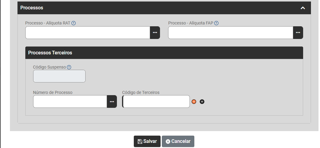 - Alíquota FAP - Preencha esse campo quando existir um processo administrativo ou judicial em que houve decisão ou sentença favorável ao contribuinte suspendendo ou alterando a alíquota FAP aplicável.