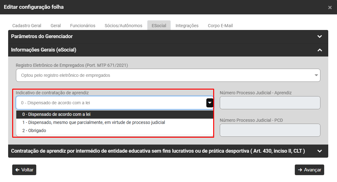 Importante, se for definido Dispensado, mesmo que parcialmente em virtude de processo judicial o Módulo irá habilitar o campo Número do Processo Judicial - Aprendiz