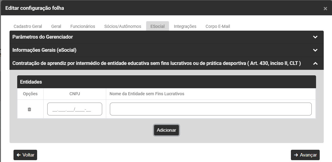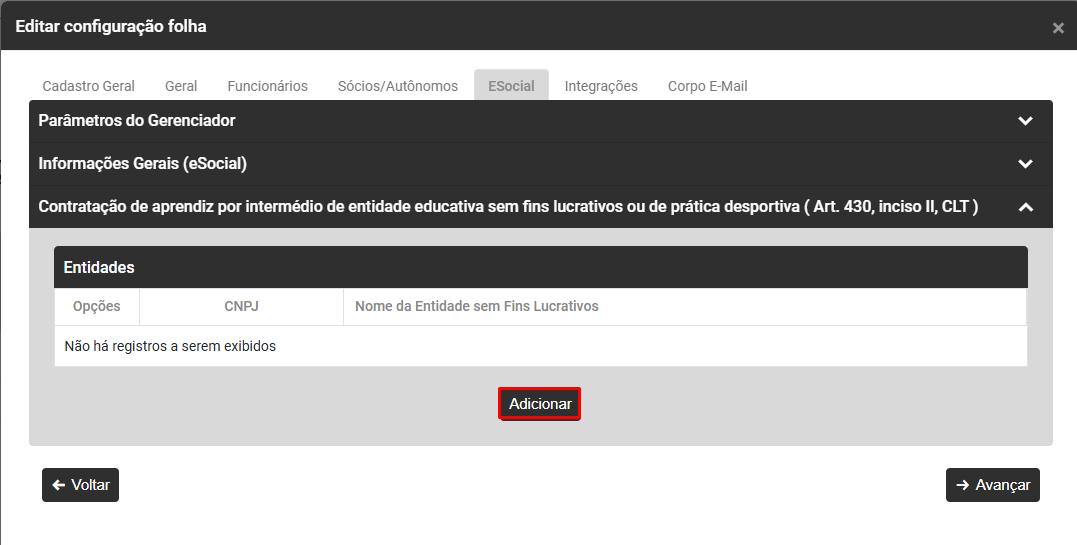 - Se a Empresa realizar a contratação de aprendiz por intermédio de entidade educativa deverá clicar no botão Adicionar