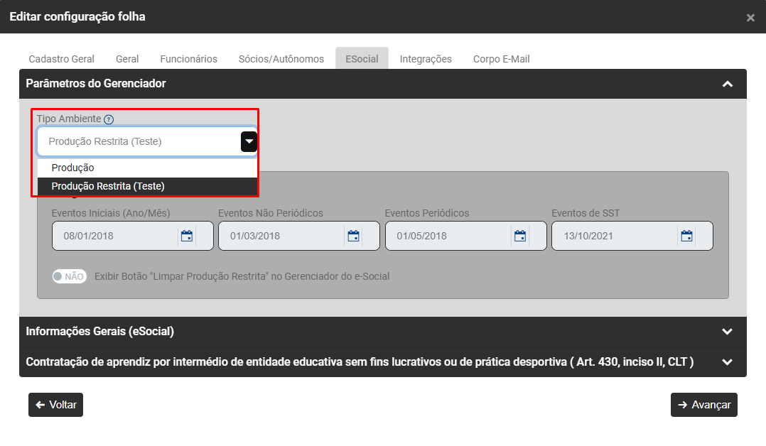 - Informe também se o Módulo deve exibir "Limpar Produção Restrita" no Gerenciador do eSocial
