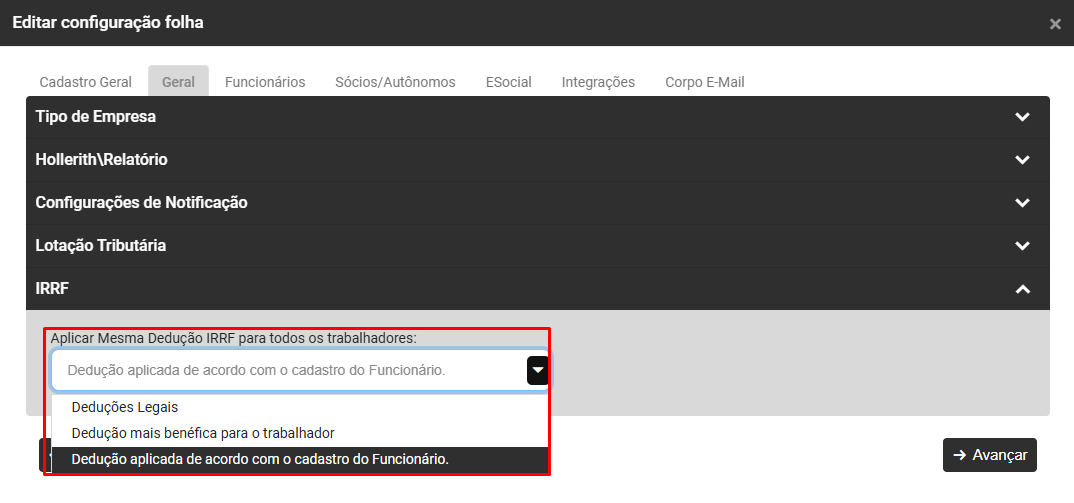 Defina se o cálculo do IRRF dos trabalhadores será considerando: