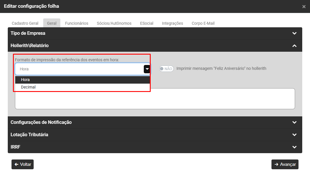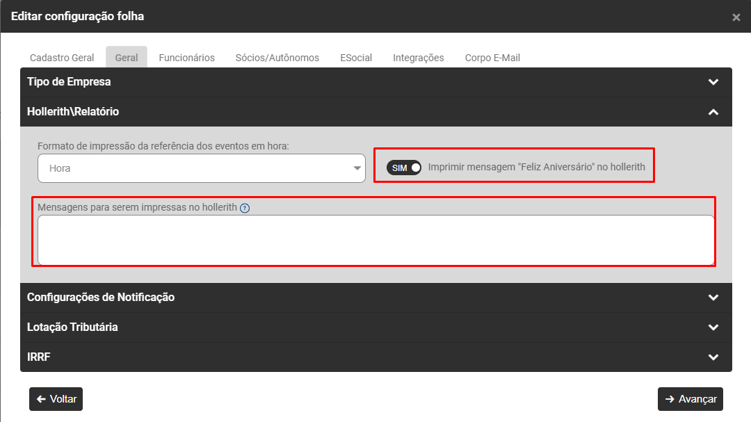 Defina também se no mês de aniversário do funcionário a mensagem "Feliz Aniversário" deverá ser impressa no Hollerith e se houver uma mensagem que deva ser impressa em todos os holleriths faça o Cadastro da mesma