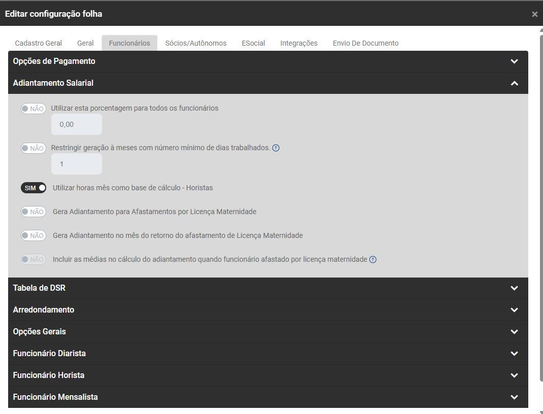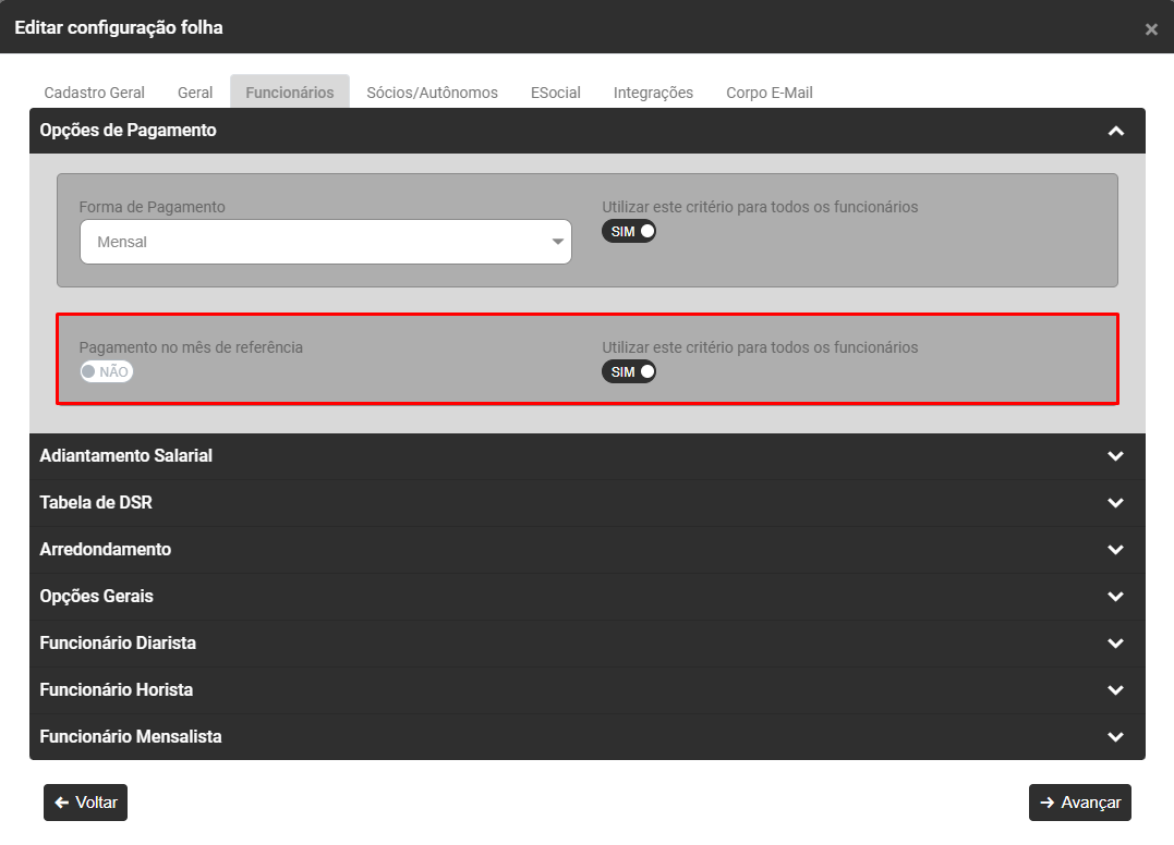 - Defina também se o Pagamento é realizado no mês de referência, caso essa opção não seja selecionada o Sistema irá considerar como Pagamento no Quinto Dia Útil do mês subsequente, em seguida defina se essa configuração deverá ser utilizada para todos os funcionários