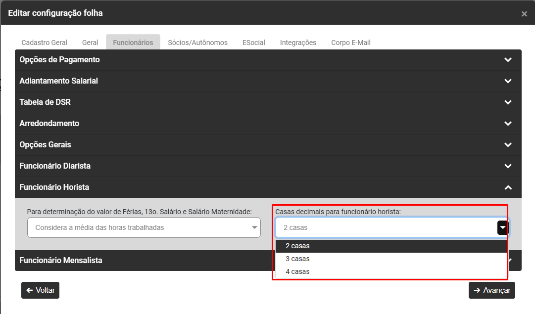 Informe a quantidade de casas decimais para funcionário horista - 2, 3 ou 4 casas