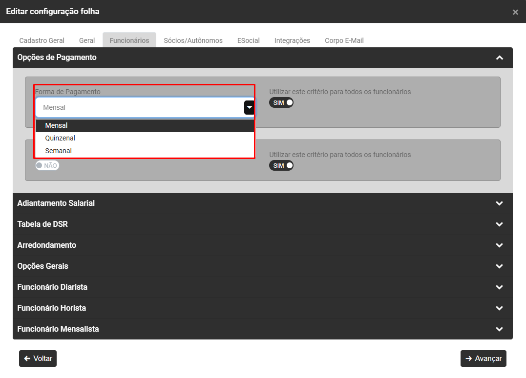 - No campo Forma de Pagamento defina se o Pagamento dos Funcionários é Mensal, Quinzenal ou Semanal e em seguida defina se essa configuração deverá ser utilizada para todos os funcionários