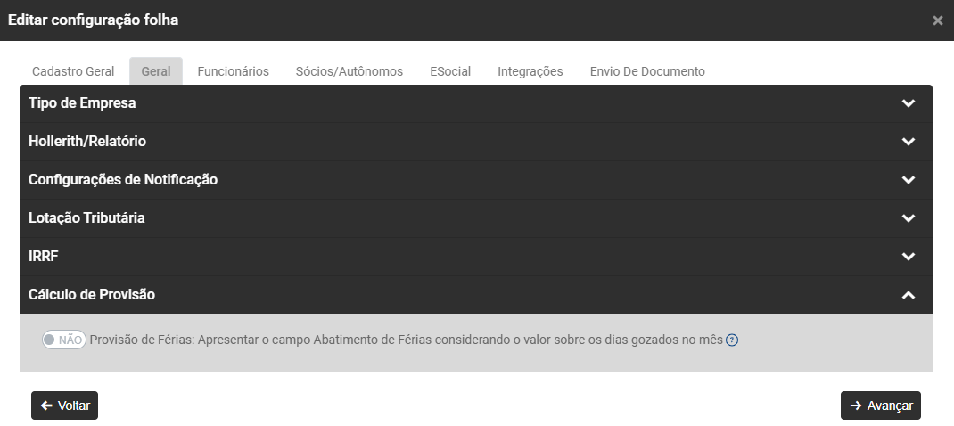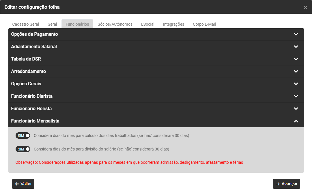 - Defina se considera dias do mês para divisão do salário (se não for definido o módulo irá considerar sempre 30 dias independente da quantidade de dias do mês)