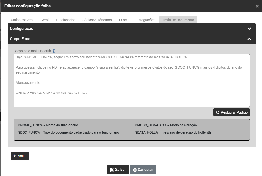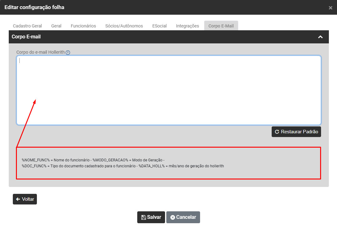 O Sistema possui um texto Padrão para que seja utilizado quando é enviado um email para o funcionário - O texto informado aqui será automaticamente inserido no corpo do e-mail durante o envio dos holerites.