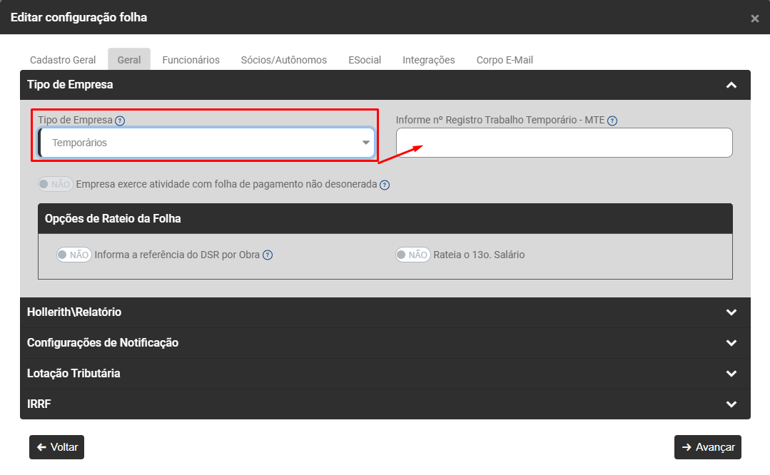 Se for definido Tipo de Empresa Temporário o Módulo habilitará o campo Informe o número Registro Trabalho Temporário - MTE