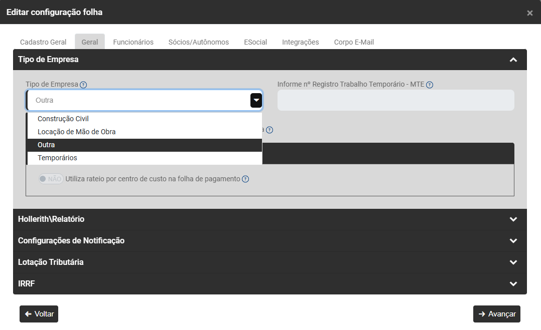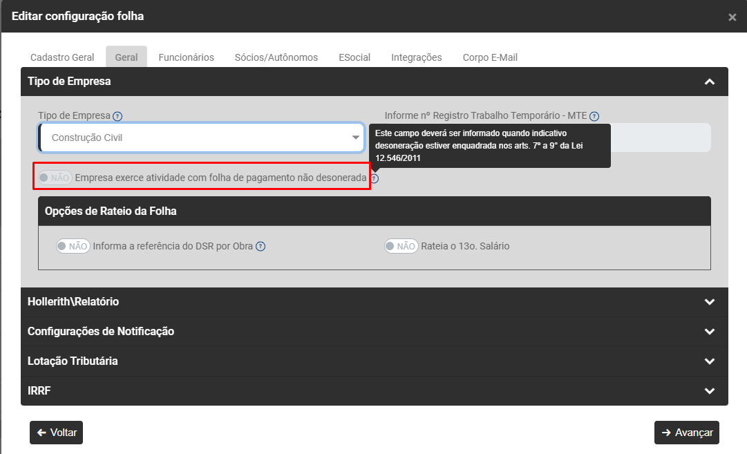 Se for definido Tipo de Empresa Construção Civil, Locação de Mão de Obra ou Temporários o Módulo habilitará o campo de Opções de Rateio da Folha