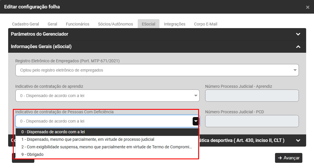 Importante, se for definido Dispensado, mesmo que parcialmente em virtude de processo judicial o Módulo irá habilitar o campo Número do Processo Judicial - PCD