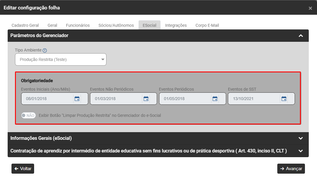 - Obrigatoriedade - Será necessário informar a data inicial para envio dos Eventos Iniciais (Ano/Mês), Eventos Não Periódicos, Eventos Periódicos e Eventos de SST