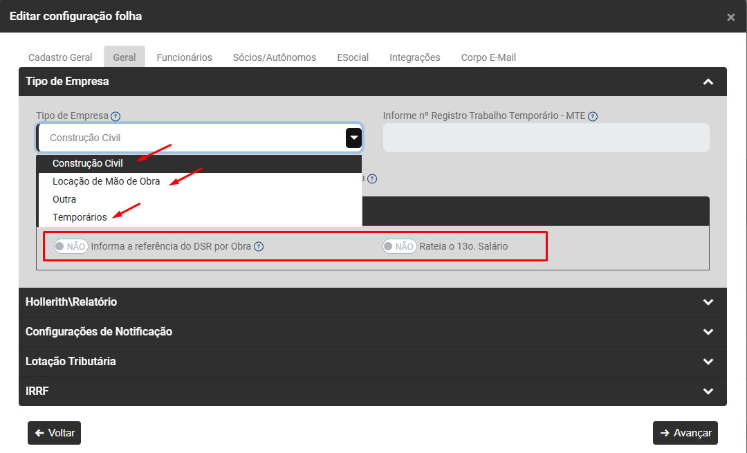 Defina se a Empresa cadastrada é Construção Civil, Locação de Mão de Obra, Outra ou Temporários