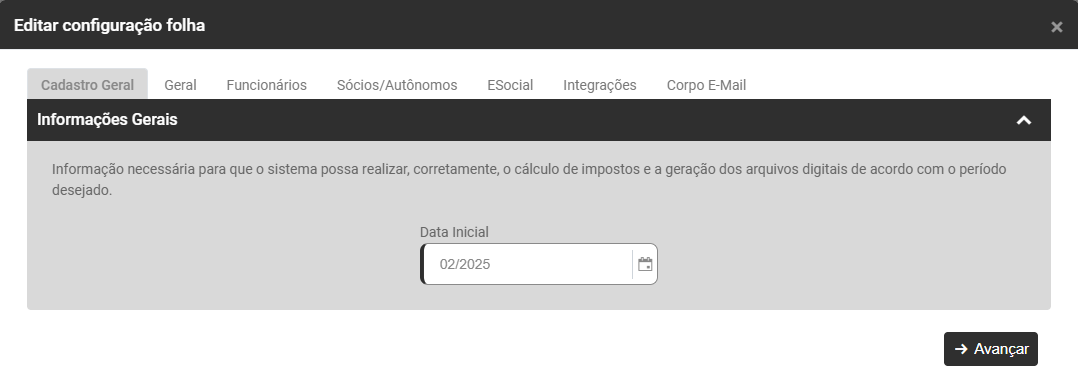 Informe na sub aba Informações Gerais a Data Inicial de utilização daquela Configuração do Módulo Folha de Pagamento, a Configuração realizada com esta data só será alterada se você cadastrar uma nova Configuração com data posterior.