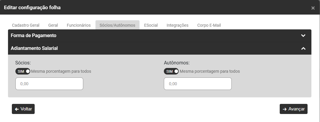- Se o Percentual de Adiantamento Salarial for igual para todos os Sócios e Autônomos, selecione a opção Utilizar esta porcentagem para todos os Sócios e Autônomos e em seguida informe o percentual do Adiantamento Salarial, caso o percentual não seja igual para todos os Sócios e Autônomos, você deverá colocar a informação no Contrato de Trabalho de cada sócio ou autônomo