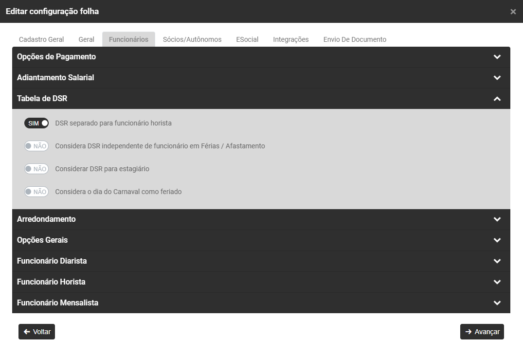 - Defina se o DSR deve ser considerado independentemente de funcionário em férias ou afastamento