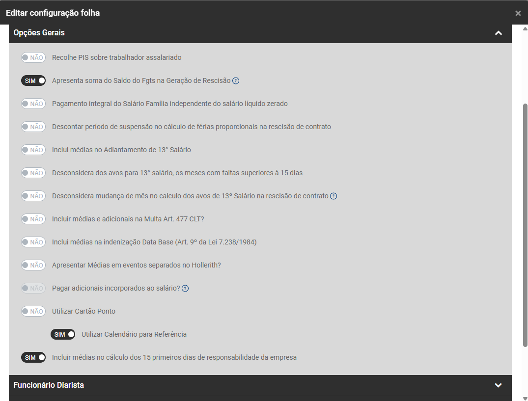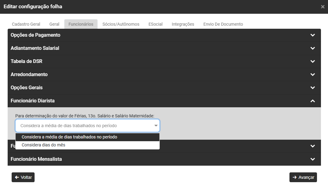 - Defina se deverá ser considerado dias do mês para cálculo dos dias trabalhados (se não for definido o módulo irá considerar sempre 30 dias independente da quantidade de dias do mês)