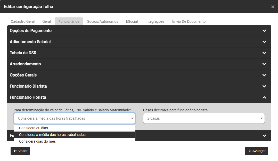 - Defina se para os funcionários horista deverá ser utilizada a quantidade de horas mês de contrato do mesmo